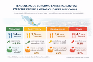 En Veracruz, el turismo y el consumo fuera del hogar mantienen cifras destacadas: la entidad reportó una ocupación hotelera promedio de 85 % durante el cierre de 2025, con una derrama económica total de casi $1 740 millones de pesos en la temporada decembrina, lo que refleja el potencial de gasto vinculado al turismo. Además, datos nacionales muestran que el mercado de servicios de alimentos y restaurantes en México fue valuado en aproximadamente USD 61 miles de millones en 2024, con proyecciones de crecimiento sostenido al 2030 conforme crece el turismo y la demanda de experiencias gastronómicas.