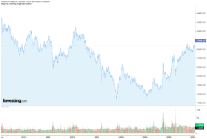 El martes de febrero de 2026, el valor del Hang Seng fue de 26,834.77 puntos, representando una subida marginal 0.22% o de 59.20 puntos con respecto al cierre del día anterior. Este índice tampoco está en sus niveles máximos históricos, similar a lo que habíamos encontrado en las otras dos bolsas chinas que hemos analizado. Su máximo histórico lo alcanzó en enero de 2018 y desde ese punto hasta la actualidad ha perdido alrededor del 23% de su valor. Su caída en la pandemia de COVID-19 fue de un poco más del 25%; pero su mayor periodo de pérdida fue el que experimentó en de febrero 2021 hasta octubre de 2022, lo que represento una reducción de más del 52%. Lo anterior, debido a una tormenta perfecta originada por una combinación de regulaciones domésticas muy agresivas en China, junto con presiones macroeconómicas globales y la política de Zero-COVID, que vivió toda China. No obstante, desde ese suelo, el Hang Seng ha tenido un rebote de más del 73% hasta la fecha, lo cual representa un excelente rendimiento para un inversionista que hubiera entrado en ese momento, en un fondo de inversión o ETF que siga a este importante índice.
