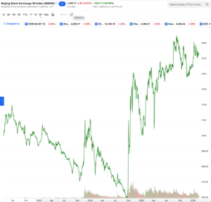El BSE 50 index cerró en 1,529.77 puntos el 19 de febrero de 2026, representando un -0.22% o -3.40% con respecto al día anterior. No obstante, si analizamos el rendimiento que ha tenido este índice en los últimos cinco años es espectacular, casi del 53%, considerando que esta Bolsa de Valores en realidad inició en el periodo de pandemia, lo que refleja el alto potencial de crecimiento de este mercado, por el tipo de empresas y los sectores que esta incluye. En su breve historia, su mayor caída fue en octubre de 2025, representando una disminución de más del 45% desde su máximo histórico previo a esa caída. Sin embargo, desde ese punto más bajo que experimentó logró una recuperación de más del 174% al alcanzar su máximo histórico del 9 de septiembre de 2025, y de un 130% aproximadamente en sus niveles actuales. Elementos adicionales para considerar, que darle seguimiento a esta bolsa china, un tanto desconocida para muchos, es de capital importancia.