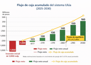 Con estos supuestos, el sistema Ulúa alcanzaría el punto de equilibrio entre 3.5 y 4.2 años, significativamente por debajo del plazo original de 5 años. Esto implica que, si la tendencia de crecimiento de usuarios se mantiene, la inversión podría recuperarse incluso antes del cierre de 2029.
