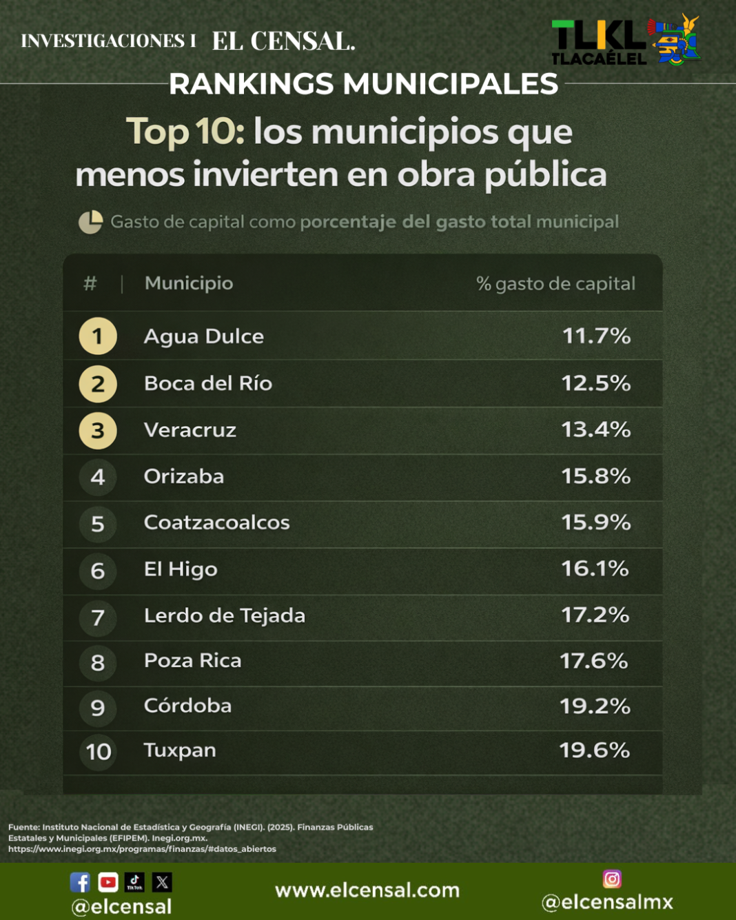 Completan los diez primeros lugares del ranking El Higo (16.2%)Lerdo de Tejada (17.2%)Poza Rica (17.6%)Córdoba (19.2%) y Tuxpan (19.6%). En todos los casos, menos de una quinta parte del presupuesto municipal se destina a inversión física.
