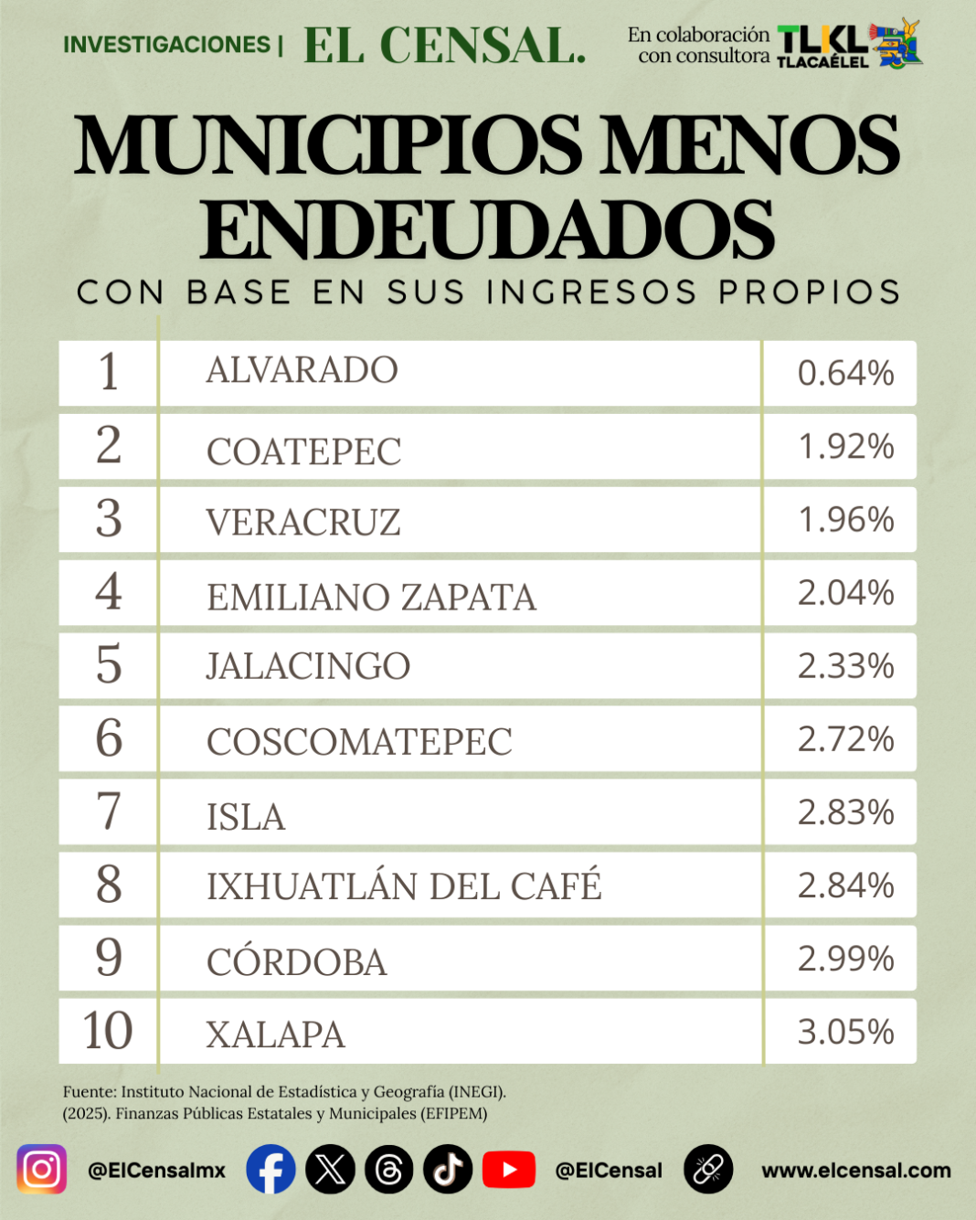 El nivel de endeudamiento municipal en México ha sido objeto de revisión constante por parte de órganos fiscalizadores, instituciones financieras y centros de análisis económico. En ese contexto, El Censal, en coordinación con la consultora TLKL (Tlacaelel), presenta el más reciente ranking de los 10 municipios menos endeudados de Veracruz con base en la relación deuda pública / ingresos propios, como parte de nuestra sección semanal de rankings municipales.