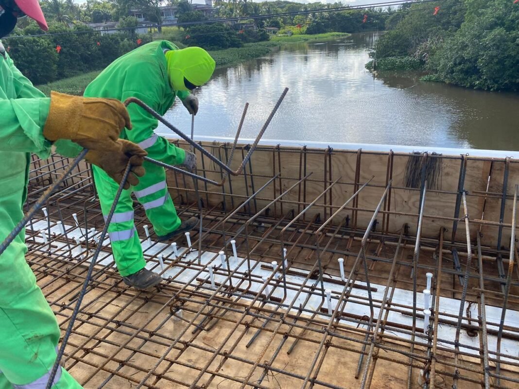También se llevan a cabo excavaciones para nuevas estructuras, la demolición del concreto de la superestructura existente, terracerías para habilitar el paso vehicular y la fabricación de vigas de acero para la nueva estructura del puente.