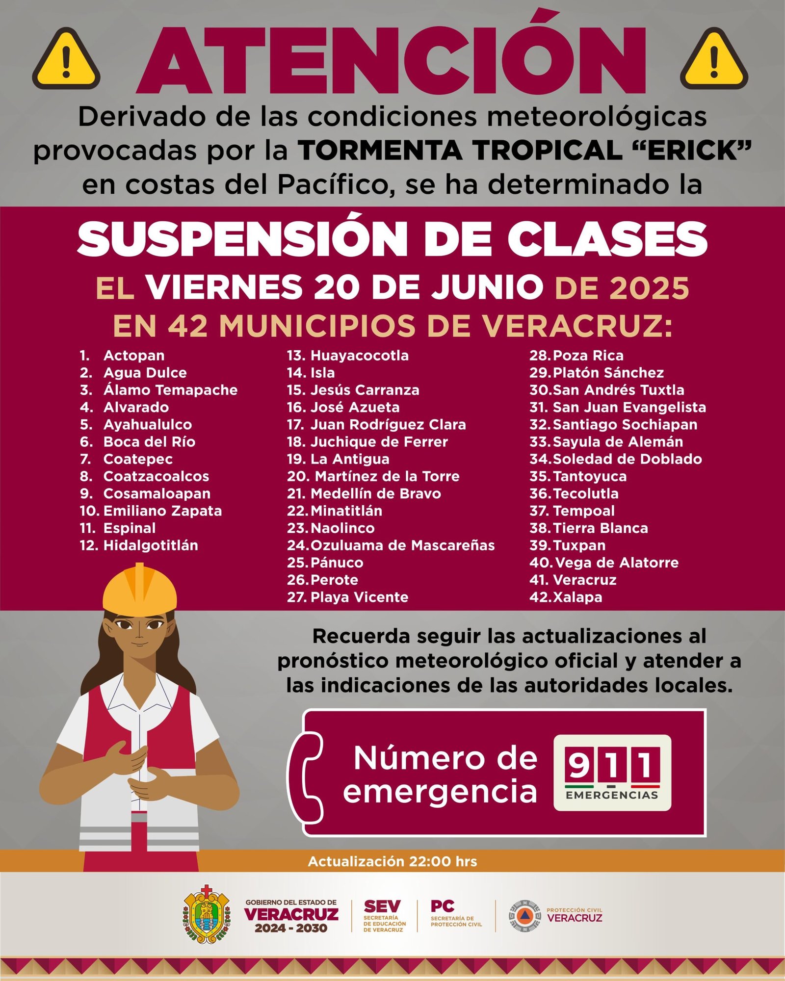 Ante las afectaciones provocadas por la Tormenta Tropical Erick, el Gobierno del Estado, a traves de las secretarías de Educación y de Protección Civil, determino suspender las clases y actividades escolares de este viernes, en los turnos matutino y vespertino, en 37 municipios, como medida preventiva.